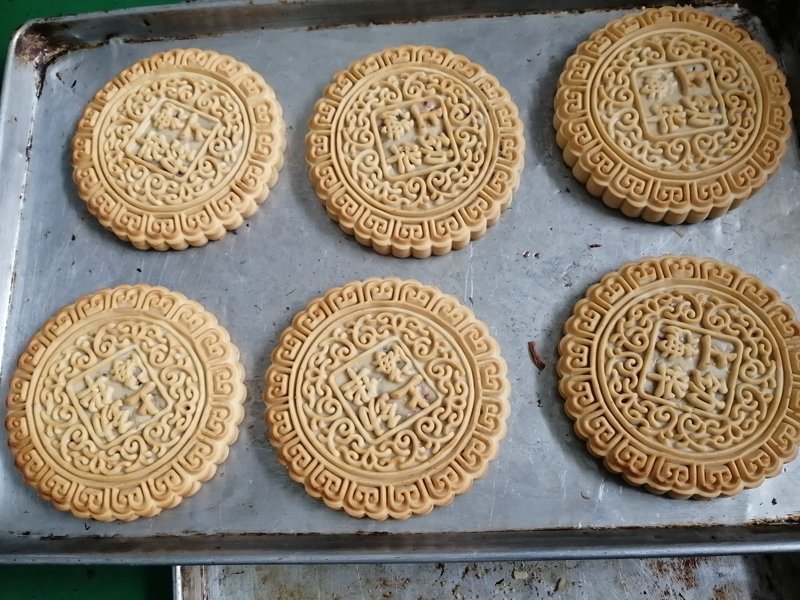 3、月餅烘烤分二次進行:(1)烤至表面微帶黃色、出爐刷蛋黃液;(2)月餅烤至表面金黃色,不塌腰。